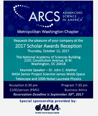 The Metro Washington Chapter, ARCS Foundation will be hosting the 48th annual Scholar Awards Reception on October 12, 2017 at the National Academy of Sciences. The reception is sponsored by The American Institute of Aeronautics and Astronautics (AIAA). Dr. Mather, NASA Senior Project Scientist, James Webb Space Telescope, and 2006 Nobel Laureate will be the 2017 Keynote Speaker.
