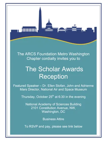 The 2018 Scholar Awards Reception will be held on Thursday, October 25th at the National Academy of Sciences, Washington, D.C. The cost is $125 per person! We can't wait to see you at our chapter's favorite event. To Pay by Check Click Here. To pay Online Click Here. Please remember to RSVP by Friday, October 19th!